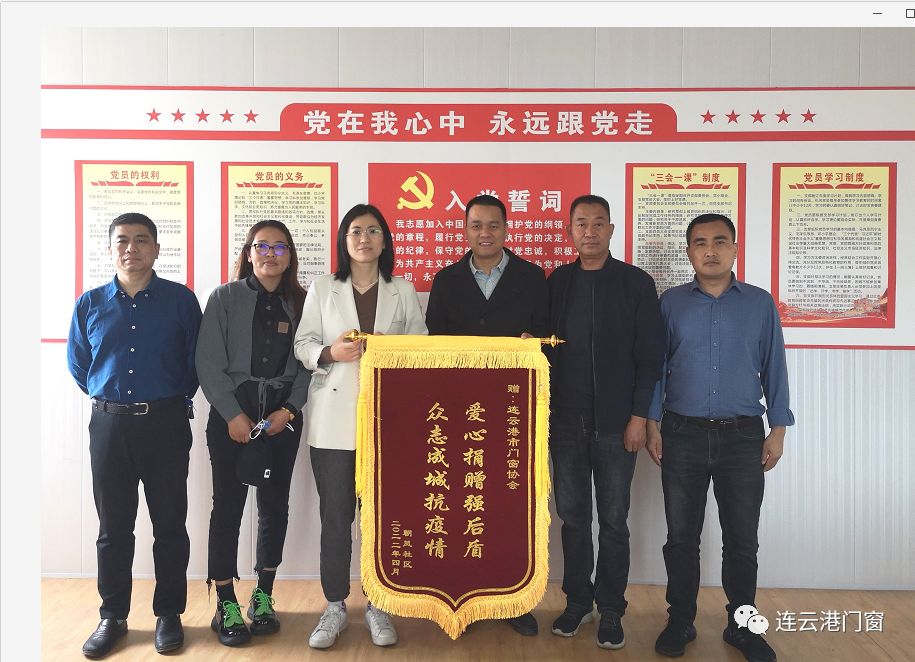 5月11日海州區南城街道周書記攜街道朝鳳社區的江書記來到市門窗協會黨支部,為我會送來一面內容為“愛心捐贈強后盾,眾志成城抗疫情”的錦旗,對我會會員在疫情期間聯合朝鳳社區抗擊疫情、捐獻物資助力一線防疫人員的善舉表示感謝!