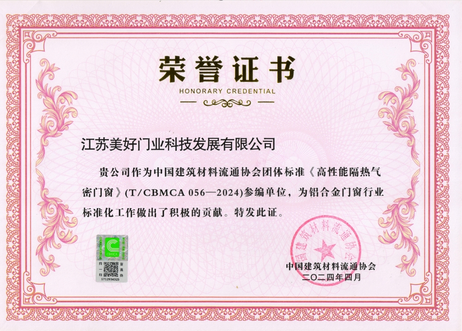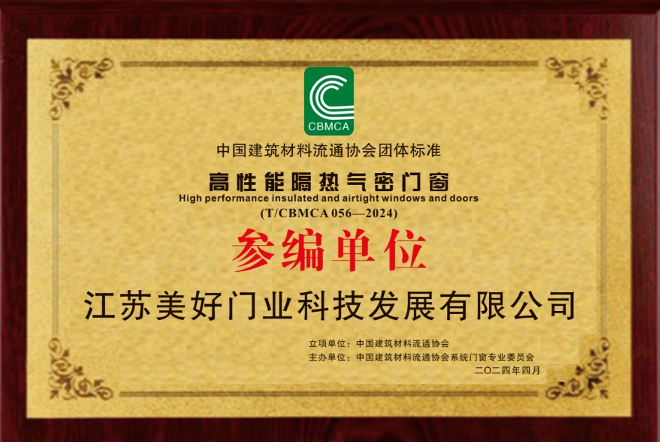 江蘇美好門業科技發展有限公司《 高性能隔熱氣密門窗》標準參編證書
